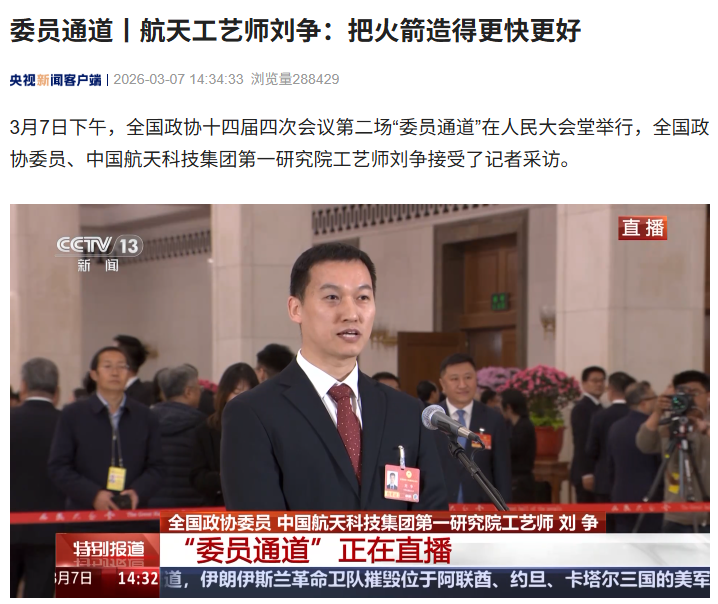 IT之家 3 月 7 日消息,据央视新闻报道,今天下午,全国政协十四届四次会议第二场“委员通道”在人民大会堂举行,全国政协委员、中国航天科技集团第一研究院工艺师刘争接受了记者采访。